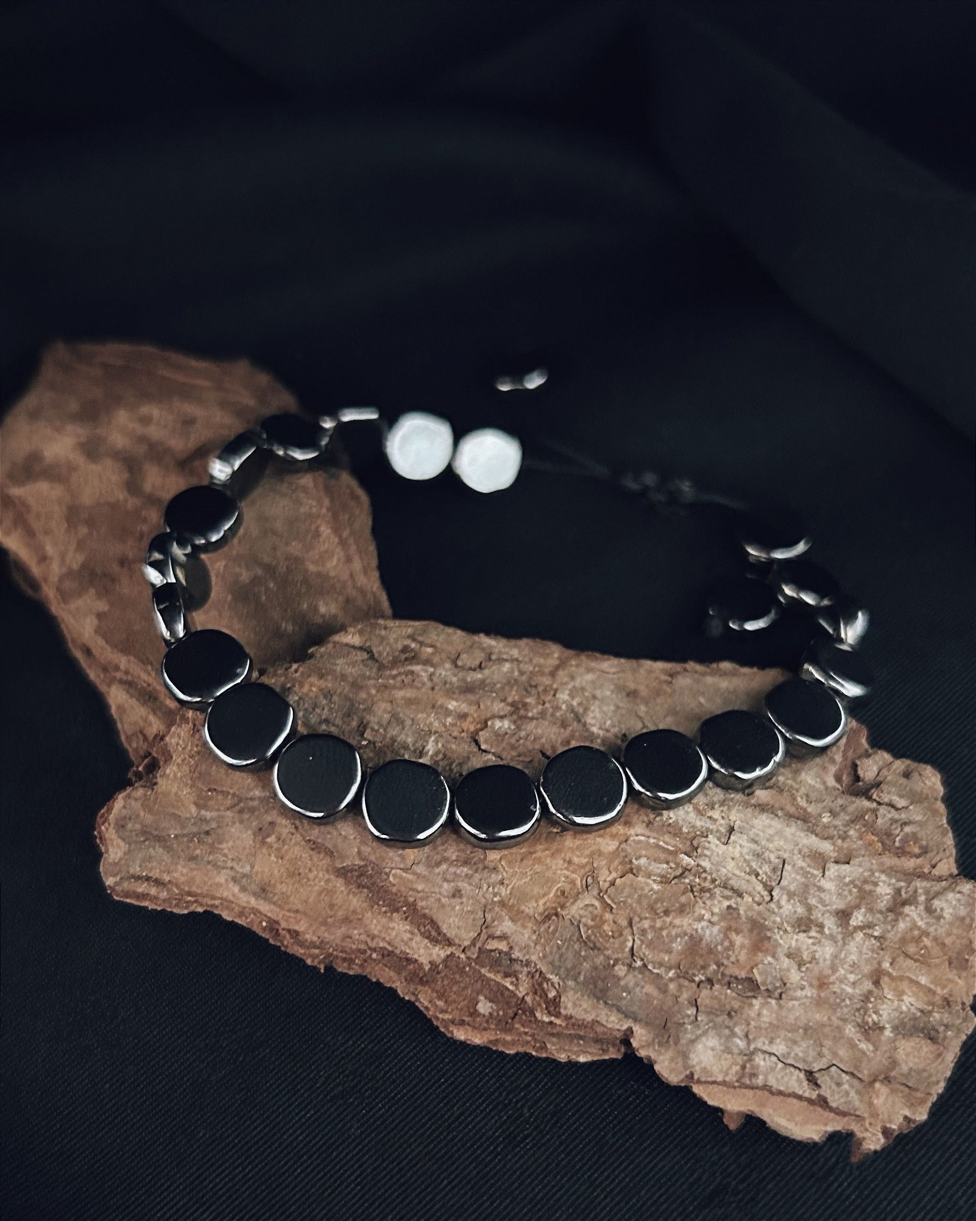 Pulseira de Pedra Natural Hematita Moeda 0,8cm Ajustável