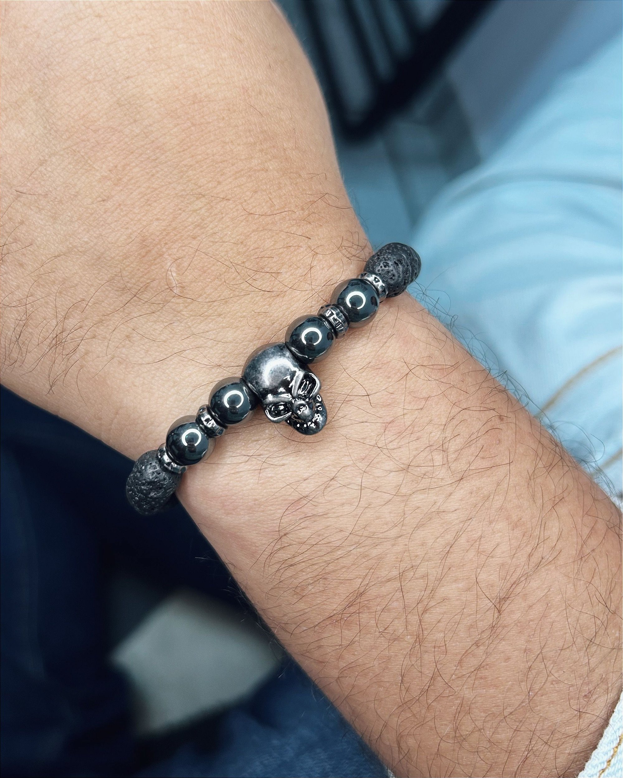 Pulseira de Pedra Natural Vulcânica c/ Hematita Caveira Grafite 18cm